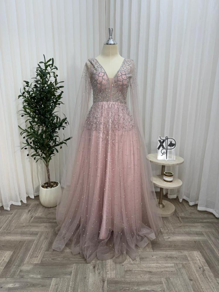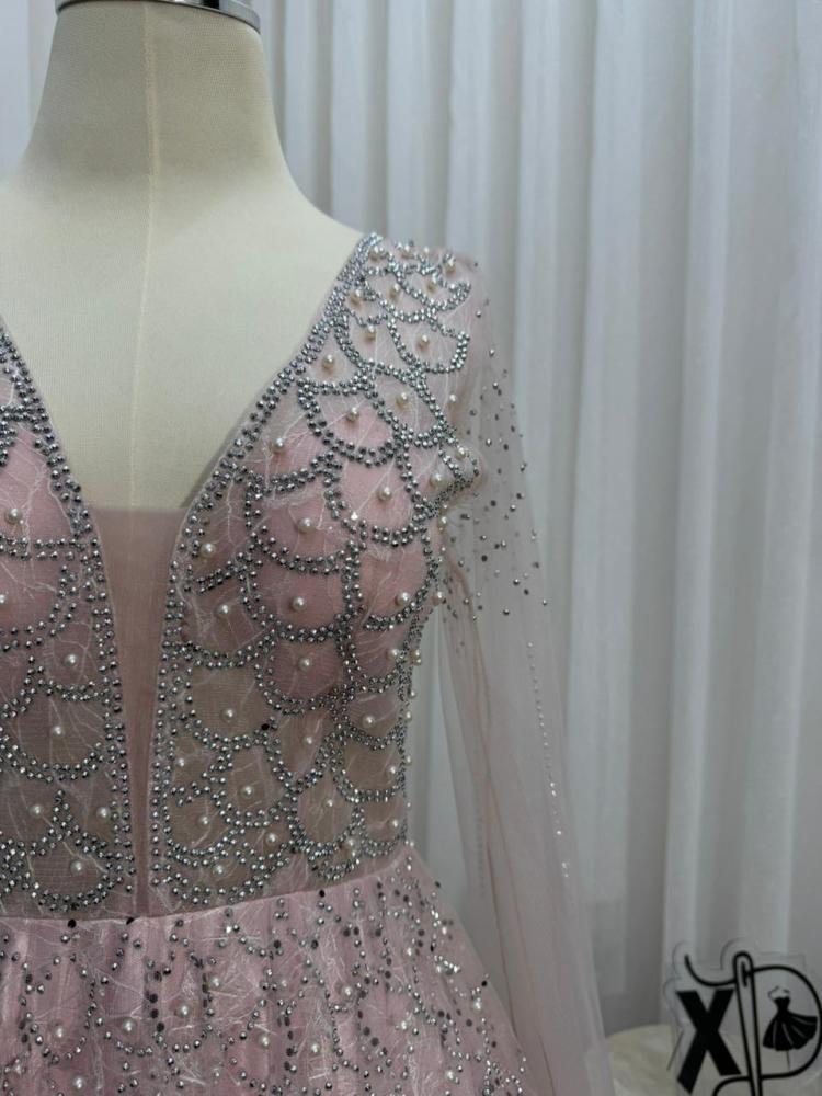 فستان سهرة وردي أنيق وناعم، يتميز بتصميم طويل الأكمام وقصة ناعمة تناسب المناسبات الرسمية والسهرات. الجزء العلوي مزين بتطريز دقيق من الكريستال والخرز الأبيض والفضي، مع فتحة رقبة على شكل V تضفي لمسة راقية.