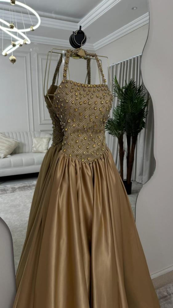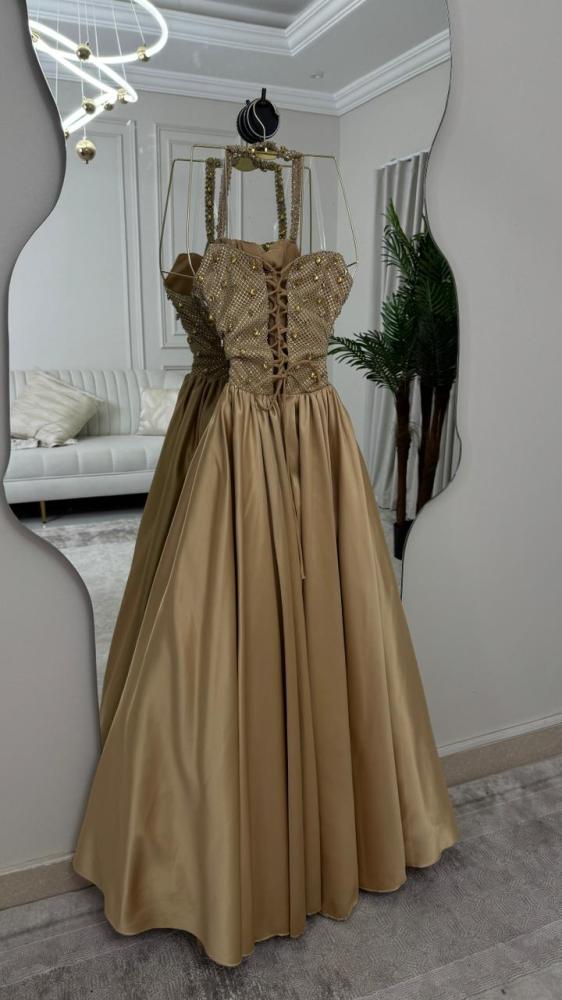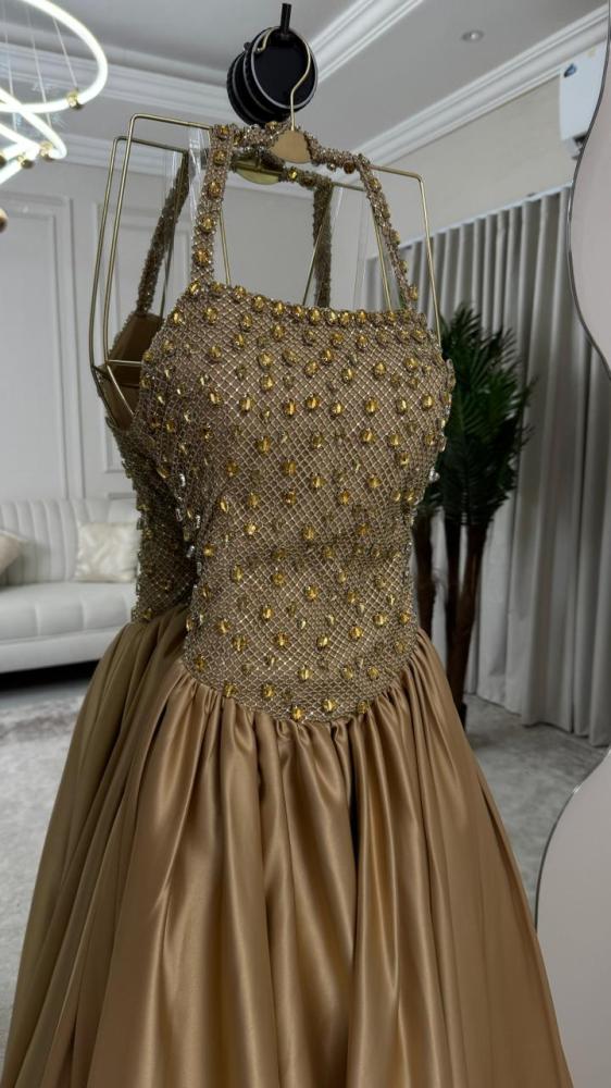 فساتين بلون ذهبي فاخرة تجمع بين الأناقة والفخامة، مصممة بتوب مزين بالكريستال على شكل حمالة مع تفاصيل شبكية دقيقة، وتنورة واسعة على شكل A-Line أو Ballgown تمنح حجمًا رائعًا وحركة سلسة. مثالية للمناسبات الرسمية والسهرات والحفلات، تمنحك إطلالة ساحرة ومتلألئة تلفت الأنظار بجاذبيتها ورقيها.
