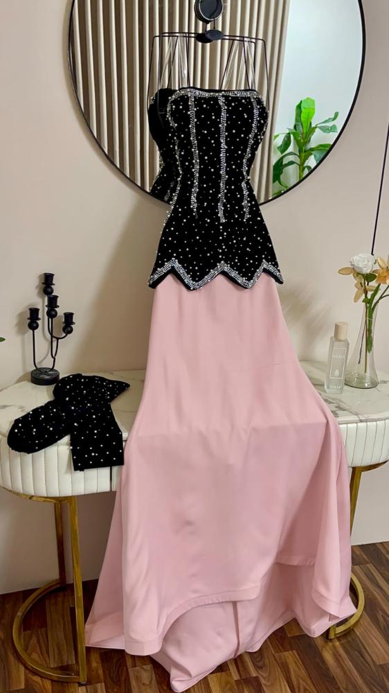 فستان جوخ فاخر يتكون من قطعتين أنيقتين، مع توب كورسيه أسود مزين بالكامل بالخرز والكريستال، وحافة متعرجة دقيقة، مع تنورة طويلة باللون الوردي الفاتح بتصميم A-Line أو ميرميد. يكمل الإطلالة أكمام أو قفازات مطرزة متناسقة، لتمنحك مظهرًا رسميًا وساحرًا للمناسبات والسهرات وحفلات الزفاف.